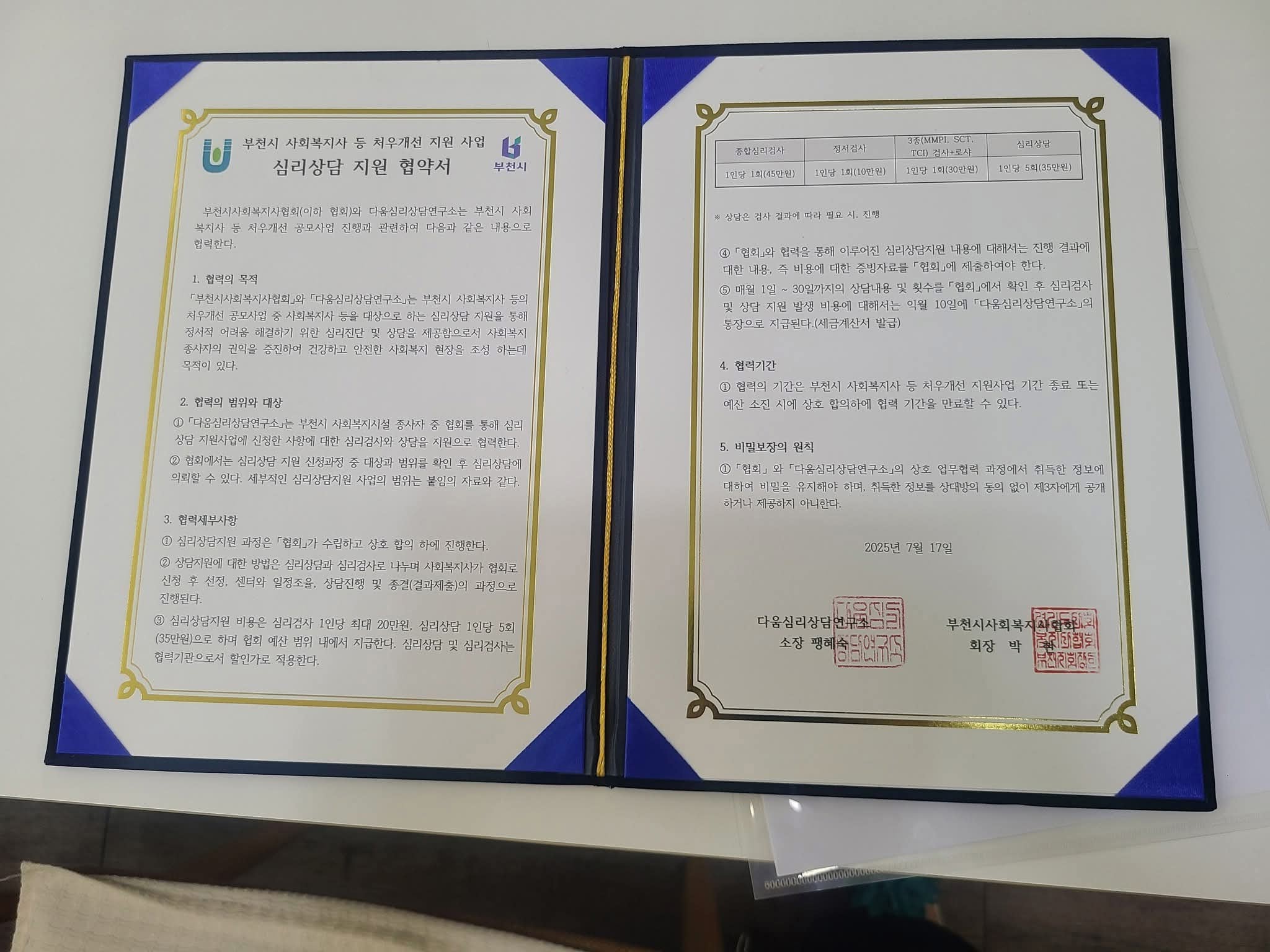 부천시 사회복지협회와 7월 협약을 맺었다. 부천시에서 일하시는 사회복지사들의 심리상담을 담당하게 되었다. 힘들고 어려운 환경에서 도움을 주는 복지사님들의 마음건강을 잘 돌보고 챙기는 일을 열심히 담당하고 싶다